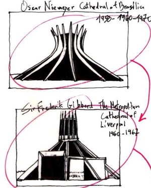 Boomerang-shaped buttresses, check. Vibrant modern stained glass, check. Spiky crown of thorns, yep. Locals lovingly refer to is as a wigwam… oh yes, Brasilia’s Roman Catholic Cathedral shares many similarities with our own strident 60s design. With its lattice of 16 curved supporting beams (exactly the same number as our own Cathedral’s) and its democratic seating in the round, the Cathedral was designed by Brazilian architect Oscar Niemeyer - a huge fan of reinforced concrete, and a lover of abstract forms and curves. Our Cathedral was his inspiration: with its lantern of glass open to the sky, allowing light to flood in (although Niemeyer went one further, allowing the windows to snake their way between the concrete ribs to the floor - but then the light is better in Brazil). Liverpool’s Fred Gibberd-designed structure was completed three years before Brasilia’s - and was, at the time (possibly even still) one of Liverpool’s most controversial modern buildings, lauded and loathed in equal measure.